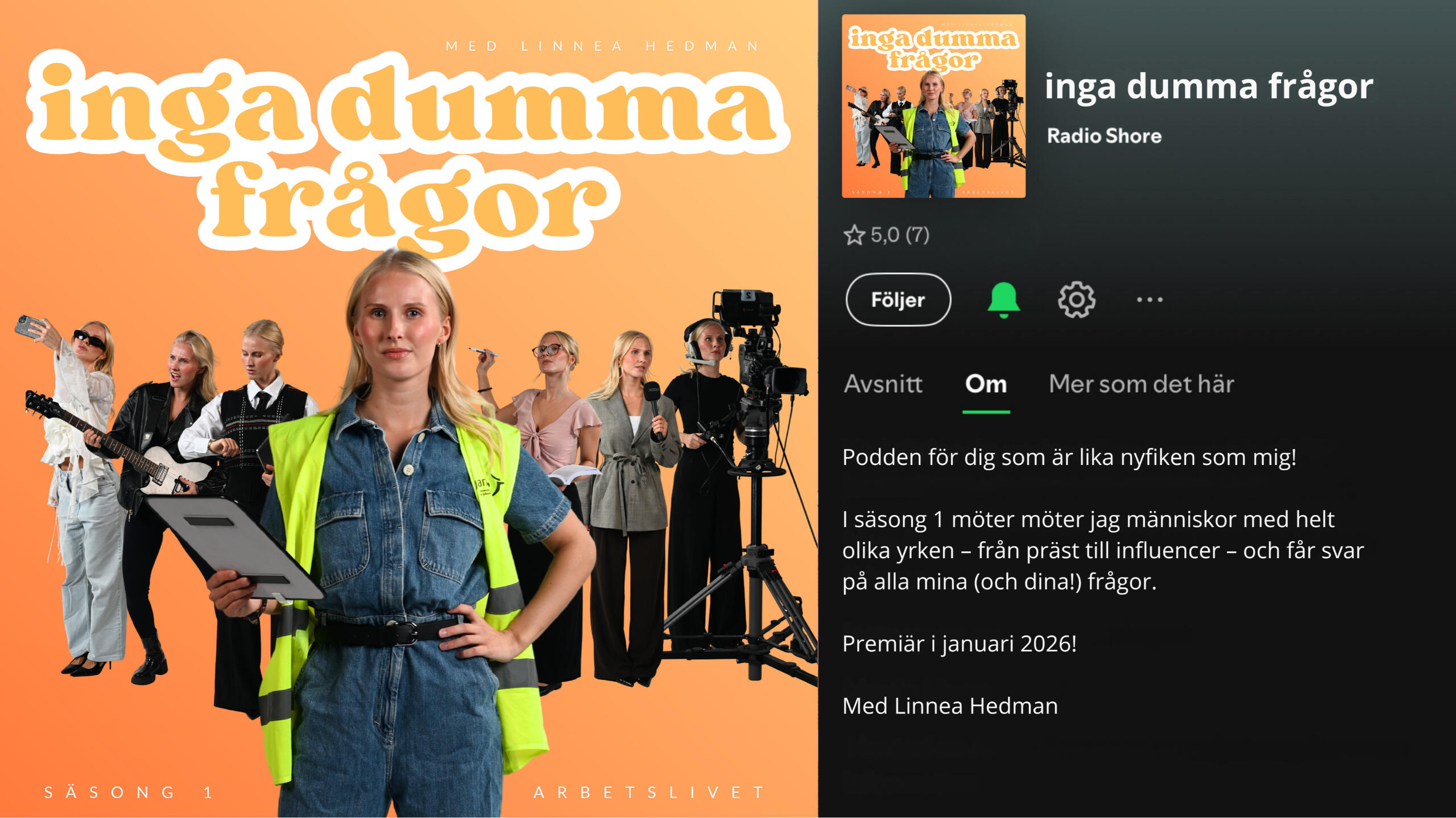 “Inga dumma frågor” är mitt eget poddprojekt – skapat ur ren nyfikenhet.I säsong 1 dyker jag in i arbetslivet och möter tio personer med helt olika yrken.Tillsammans med lyssnarna får jag ställa alla de där frågorna man alltid undrat över, men kanske aldrig vågat fråga.Första avsnittet släpps i januari 2026!