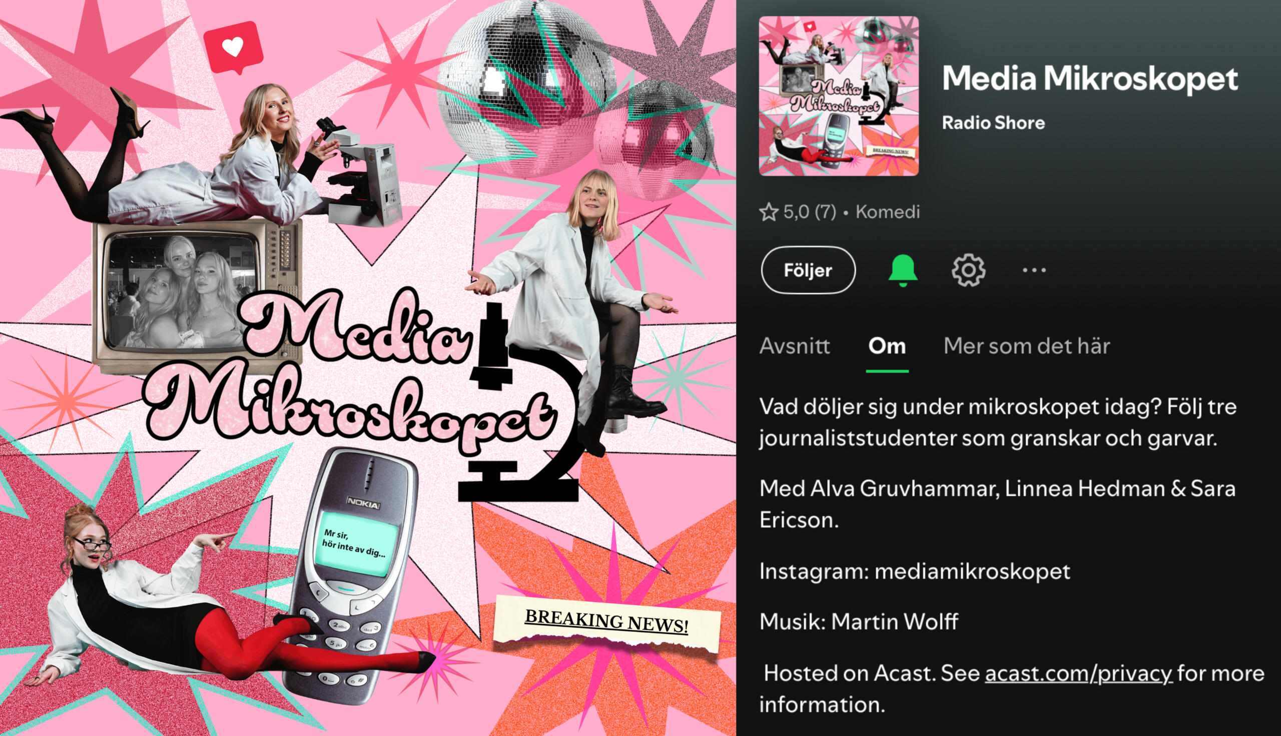 MediaMikroskopet är en studentproducerad podcast där jag tillsammans med Sara Ericson och Alva Gruvhammar utforskar medier i alla dess former – från det allra senaste till det historiska. Med en lättsam ton, insiktsfulla samtal och en gnutta humor bjuder vi lyssnarna på både skratt och nya perspektiv.
